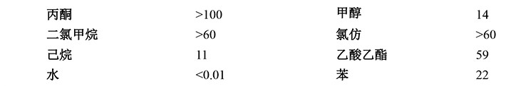 3、 溶解性@20℃ (g/100g 溶劑)